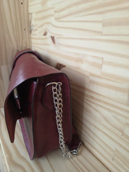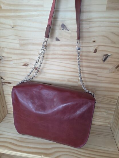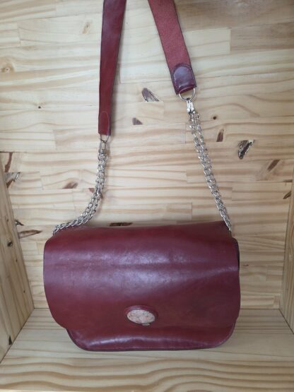 -Bandoulière ajustable et amovible : Composées d’une partie en cuir de 50cms pour plus de confort et de chaînes de chaque côté de 40 cms pour ajuster la longueur. Elle peut se retirer . Sera livré avec 2 jeux de chaînes supplémentaires.