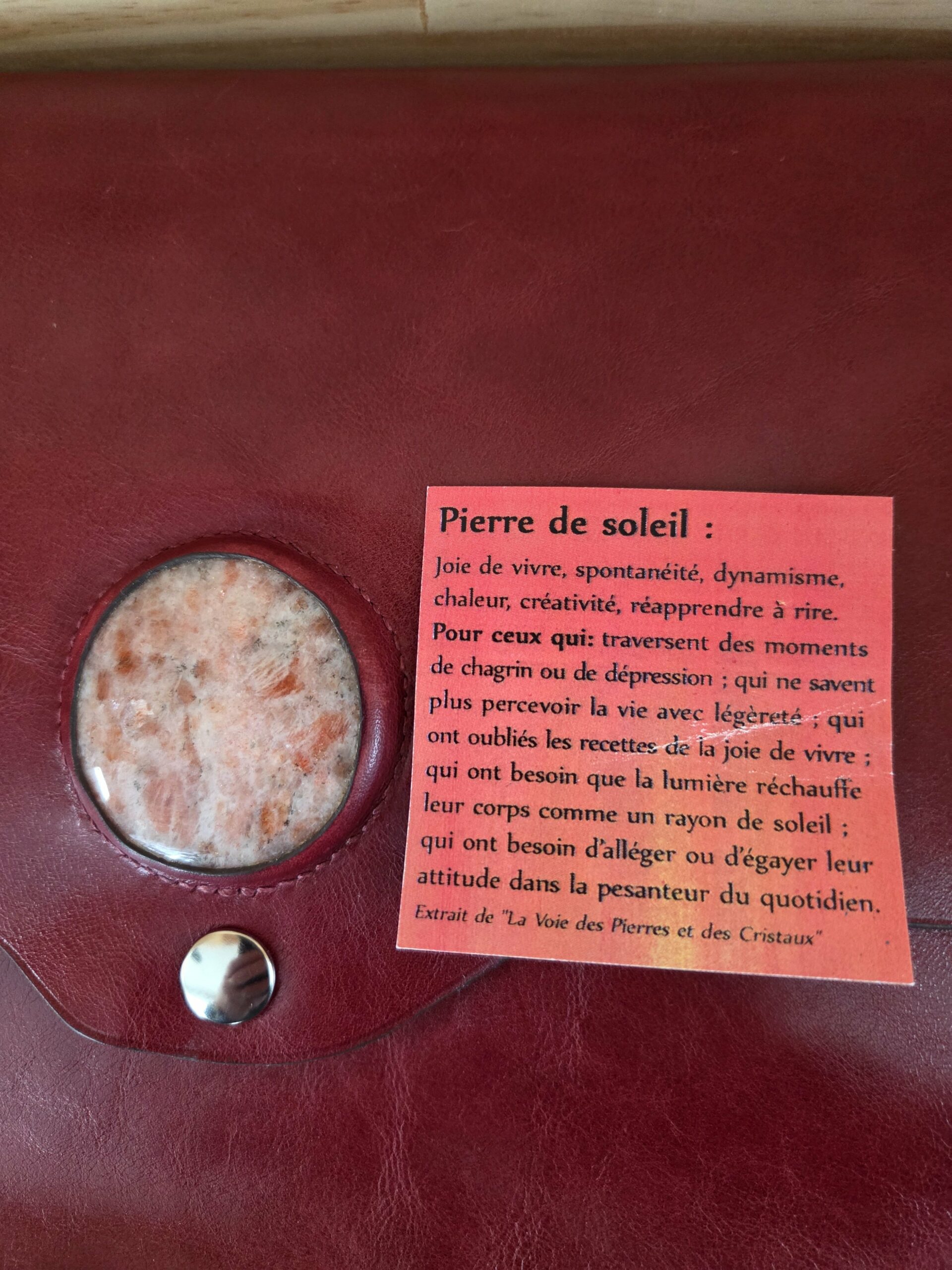 -Pierre de Soleil : Une pierre naturelle incrustée sur le rabat, symbolisant la joie de vivre, la créativité et la positivité. Idéale pour ceux qui traversent des moments de chagrin ou de stress, elle apporte légèreté et énergie.